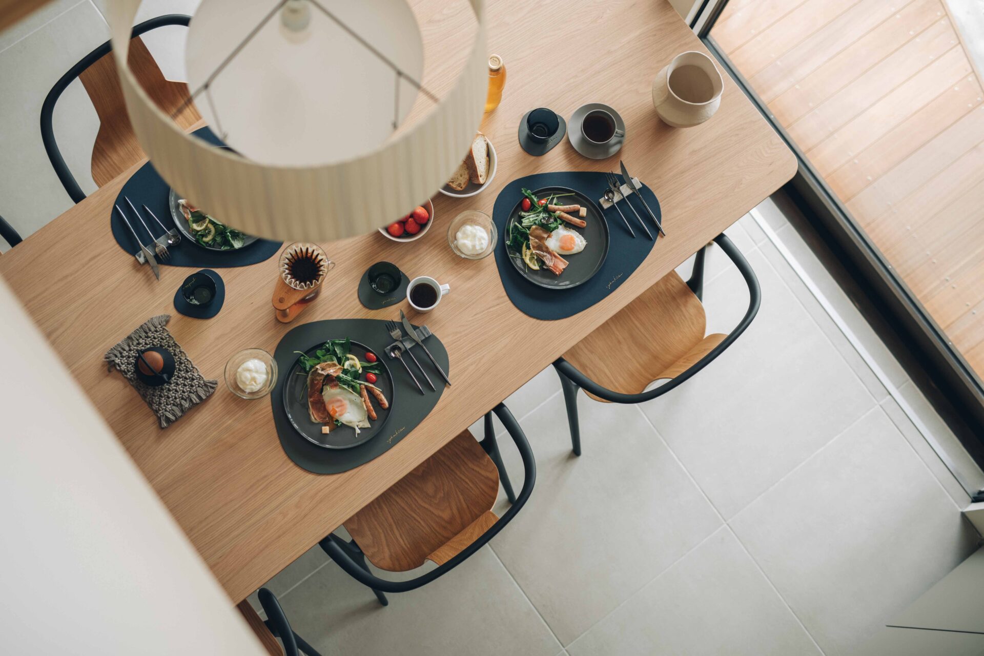 庭全体を眺めることができ、朝日が差し込む暖かいダイニング。