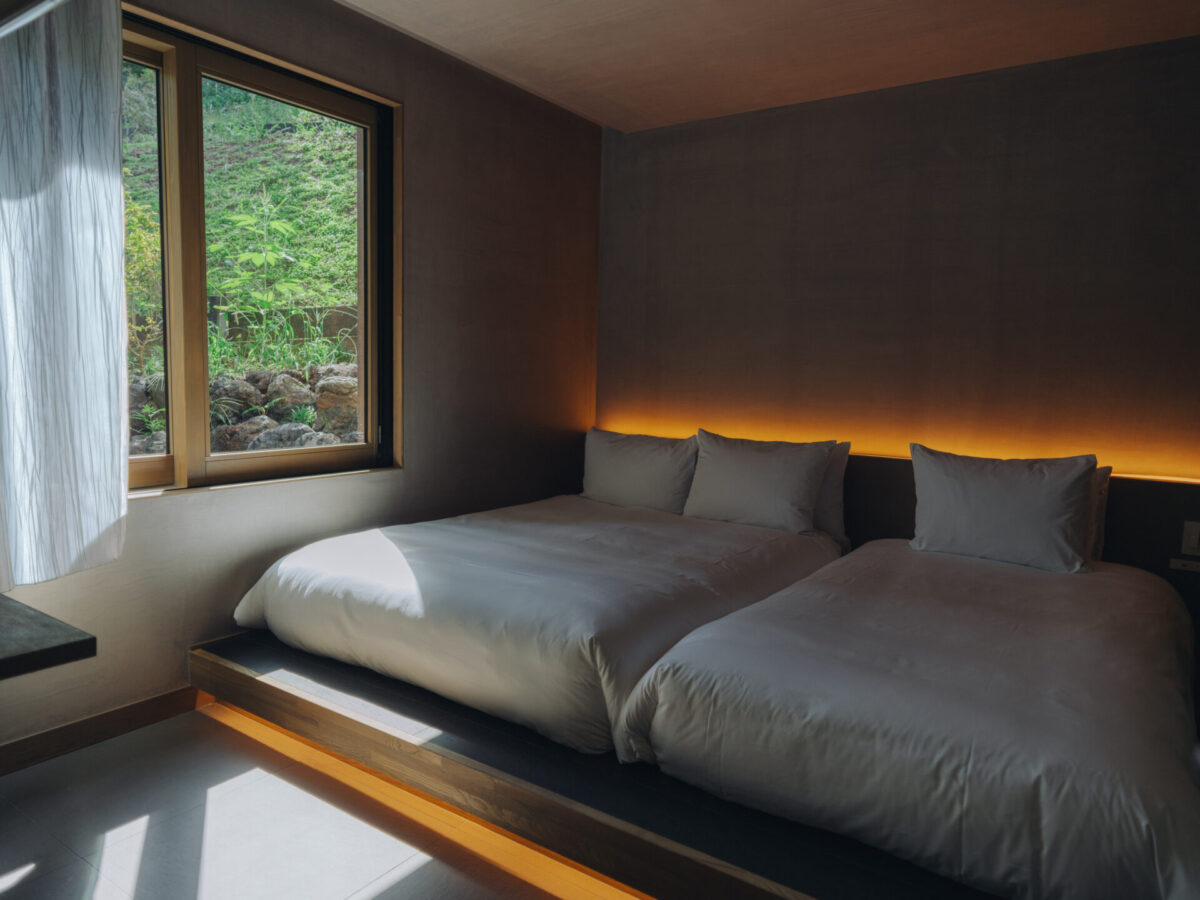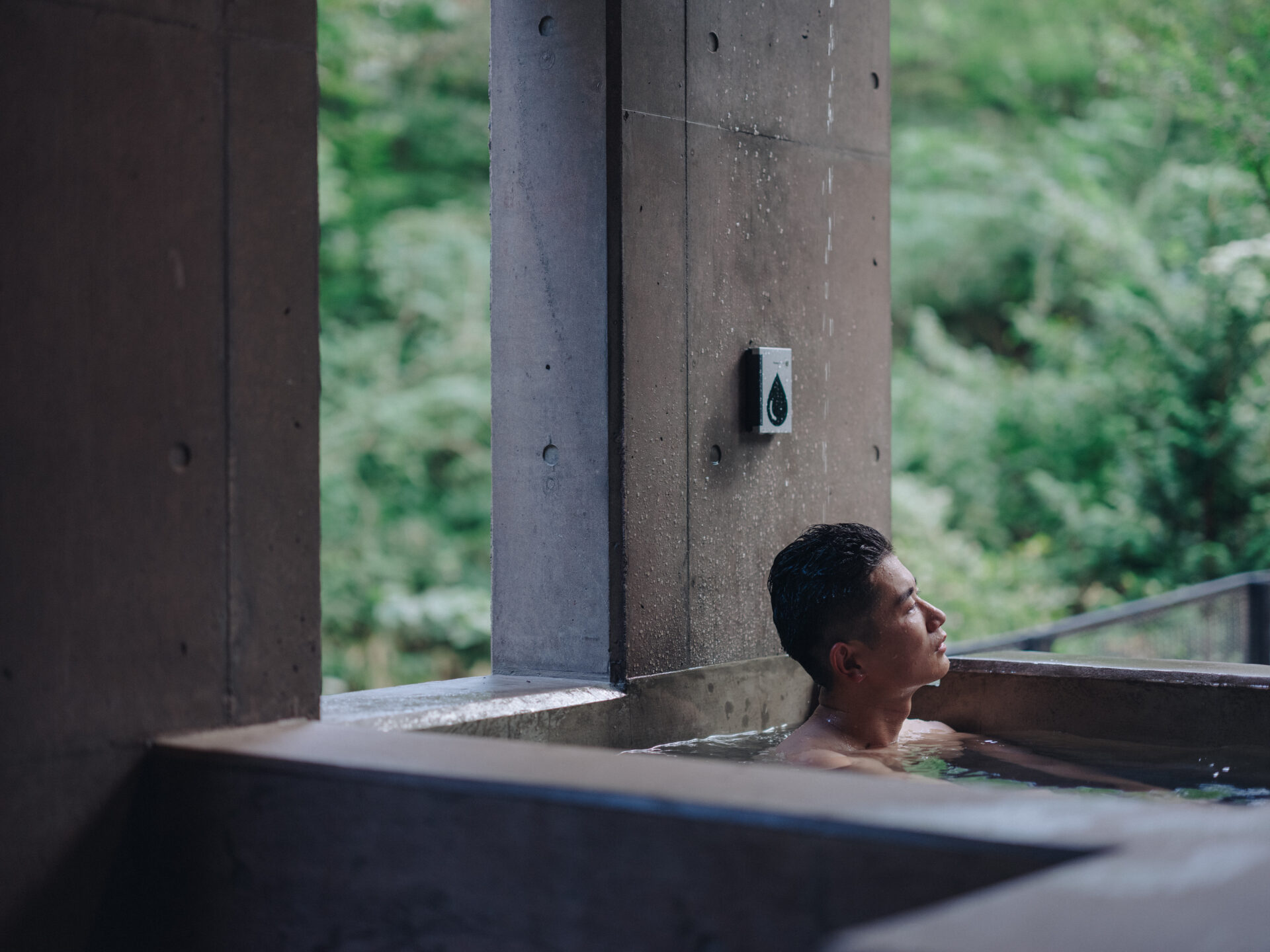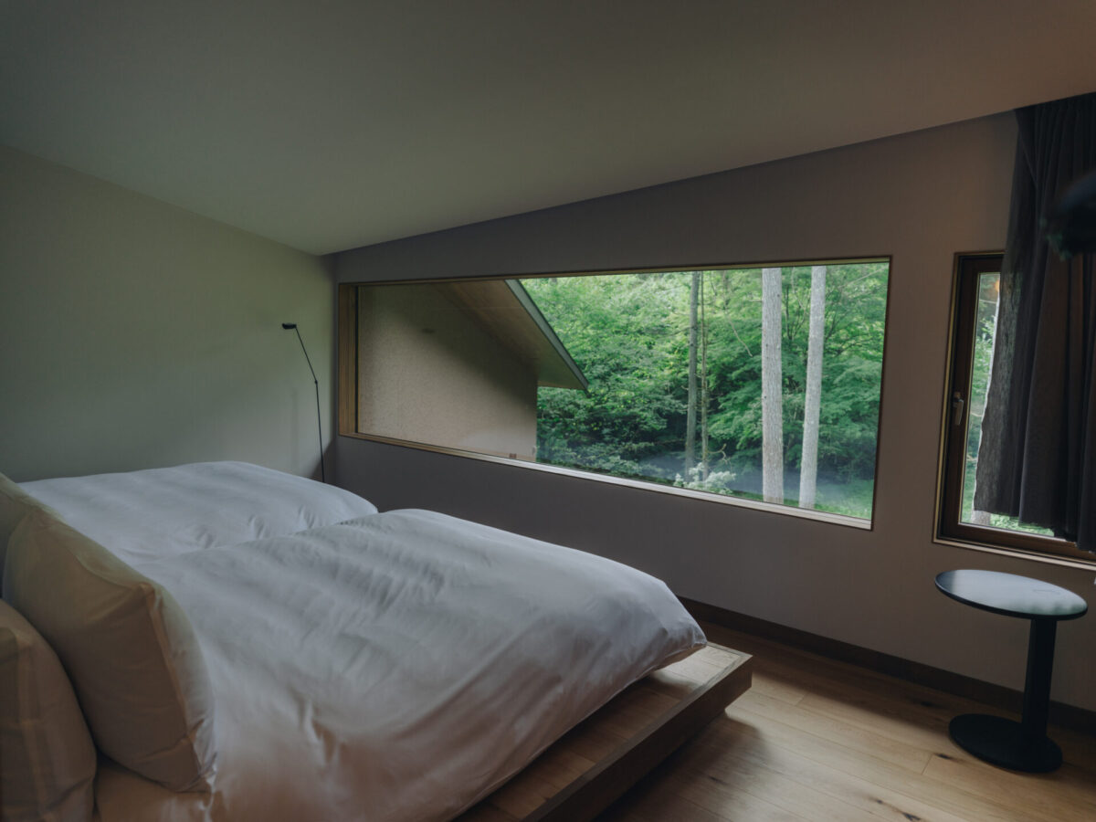 大きな窓の先に広がる森と川。寝湯で整う、自然と一体になるような癒しの時間。