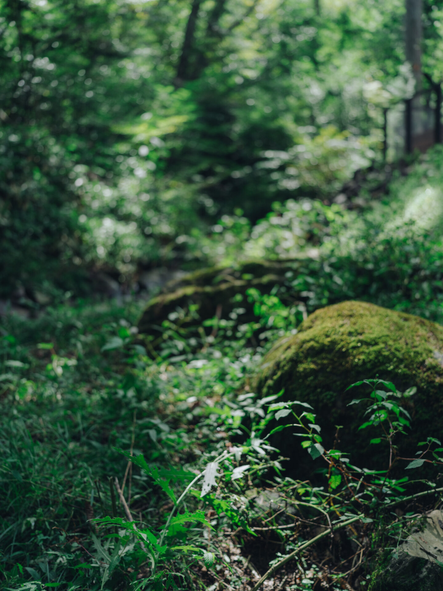 スマホを置き、森の匂いと川の音に耳を澄ませるひととき。