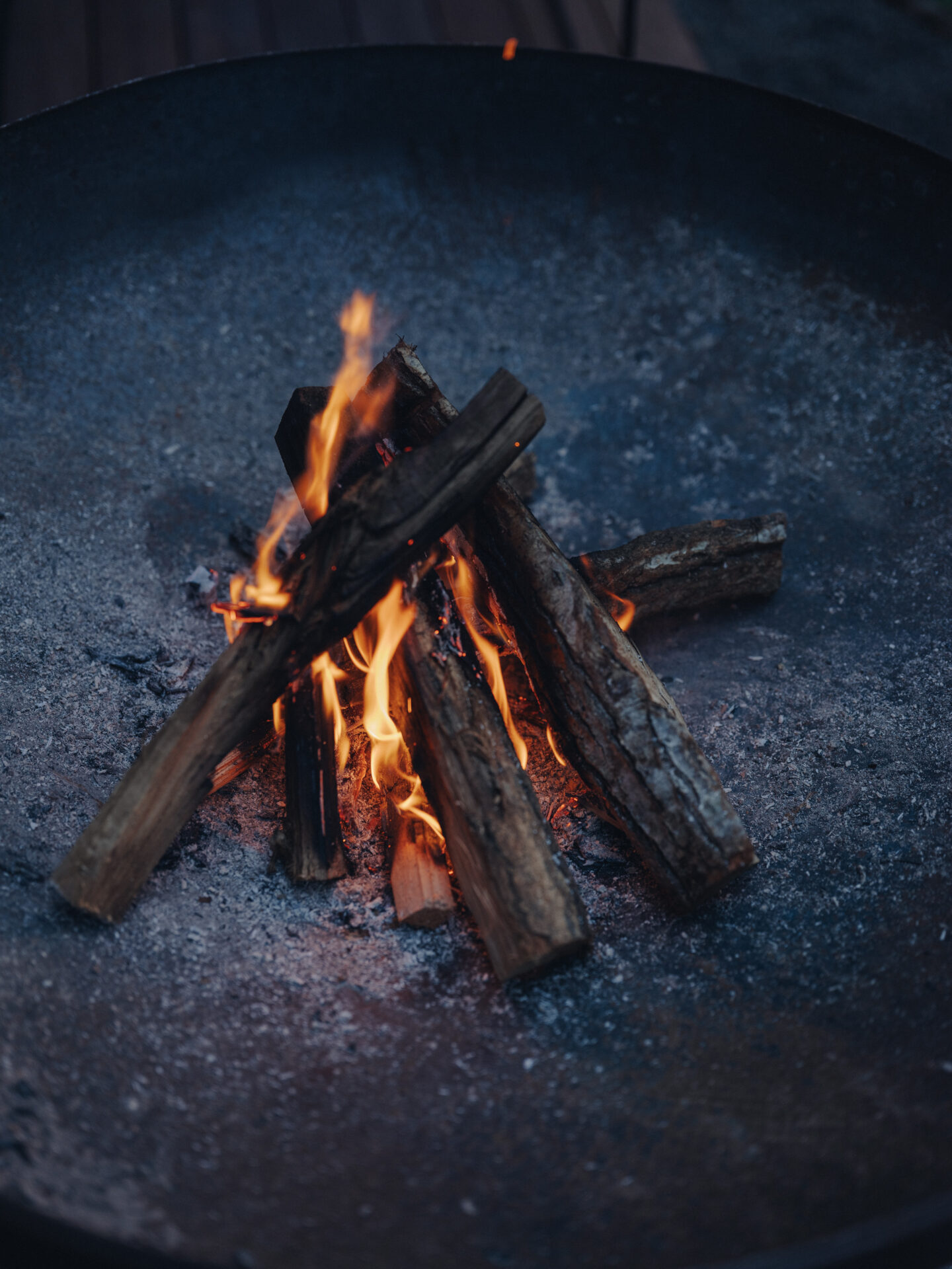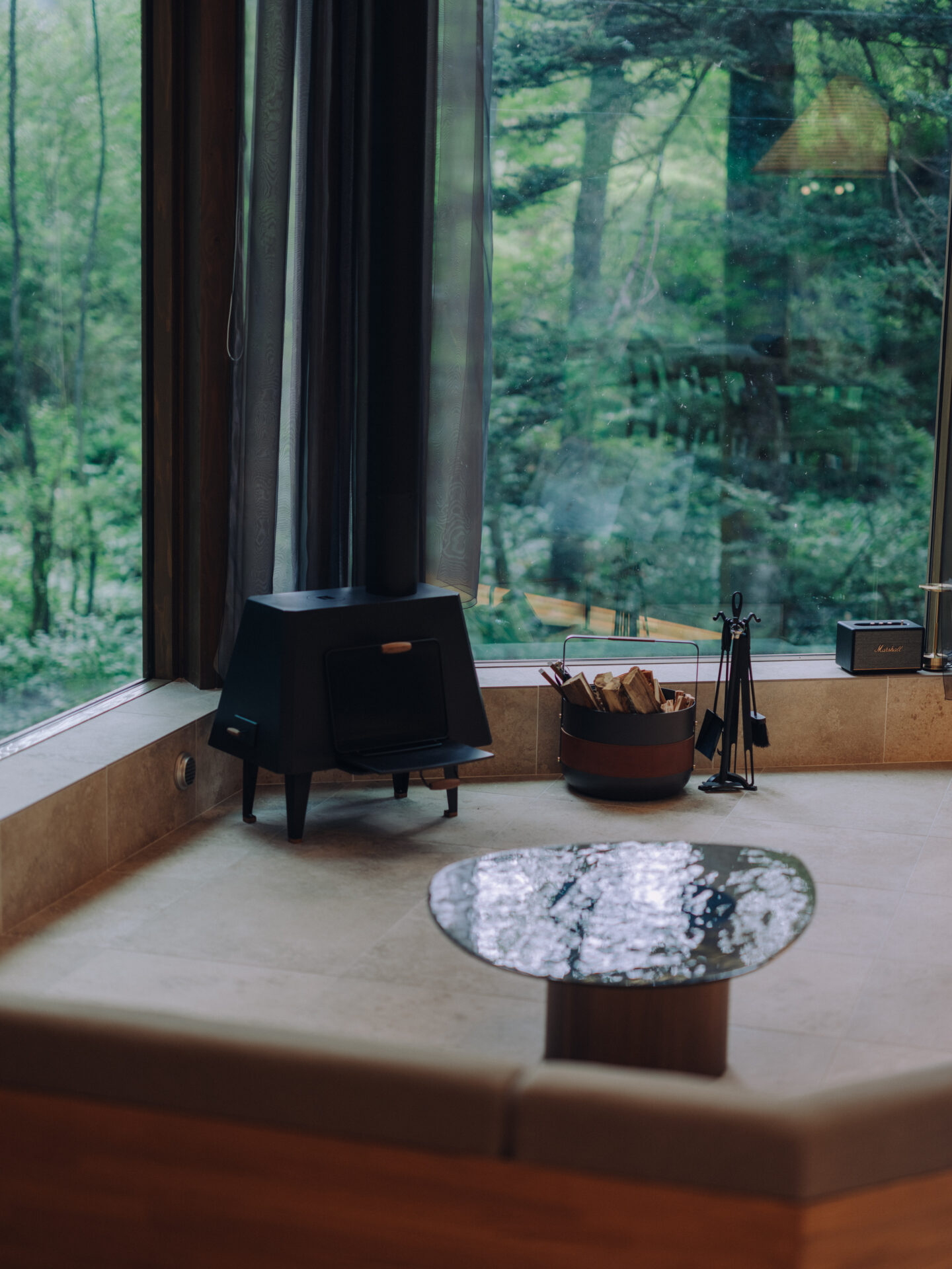 森に抱かれているような景色眺めながら薪ストーブを囲む