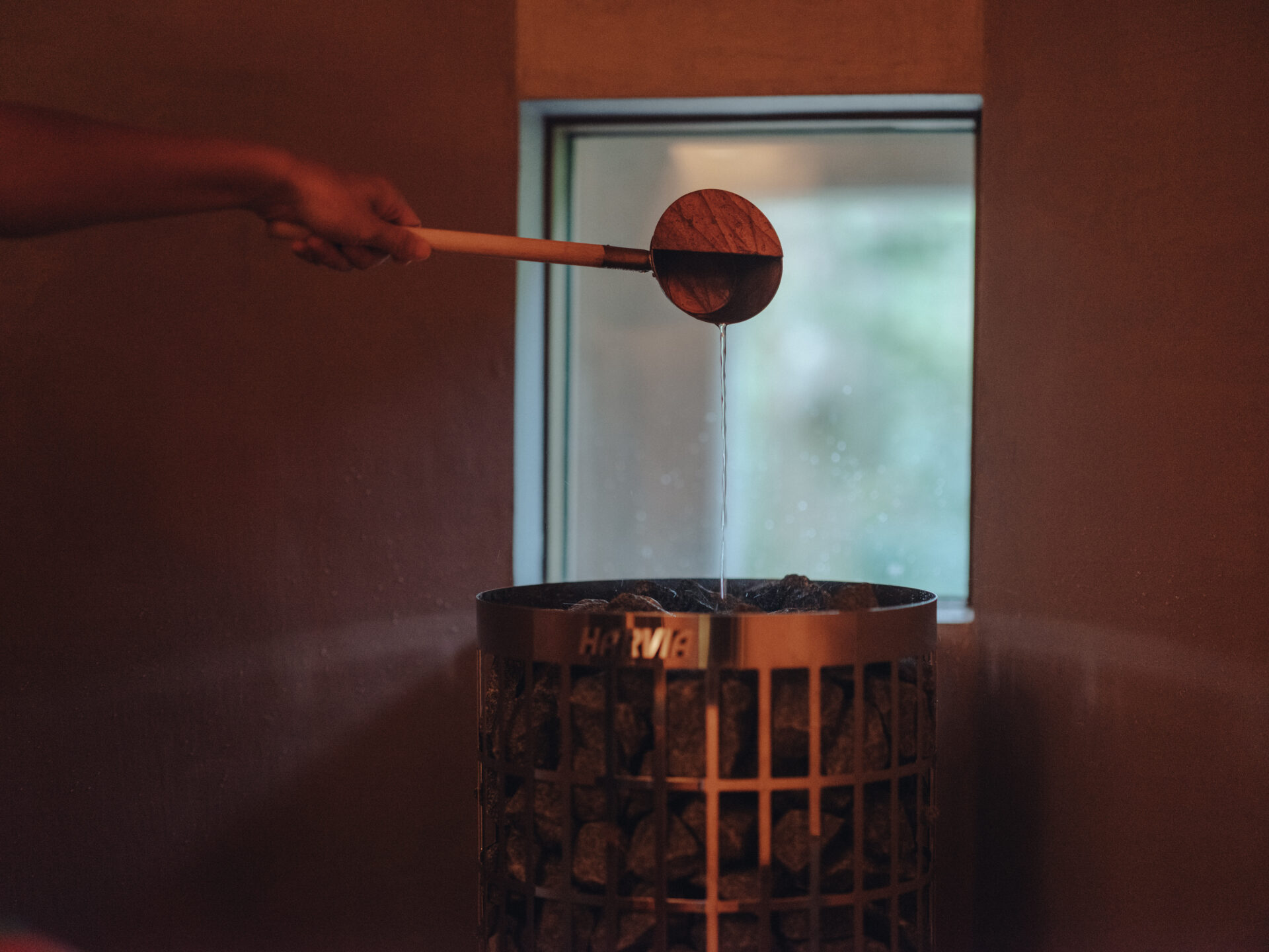 365で唯一のHarvia製サウナで森を眺め、川辺の水風呂とテラスで深呼吸。